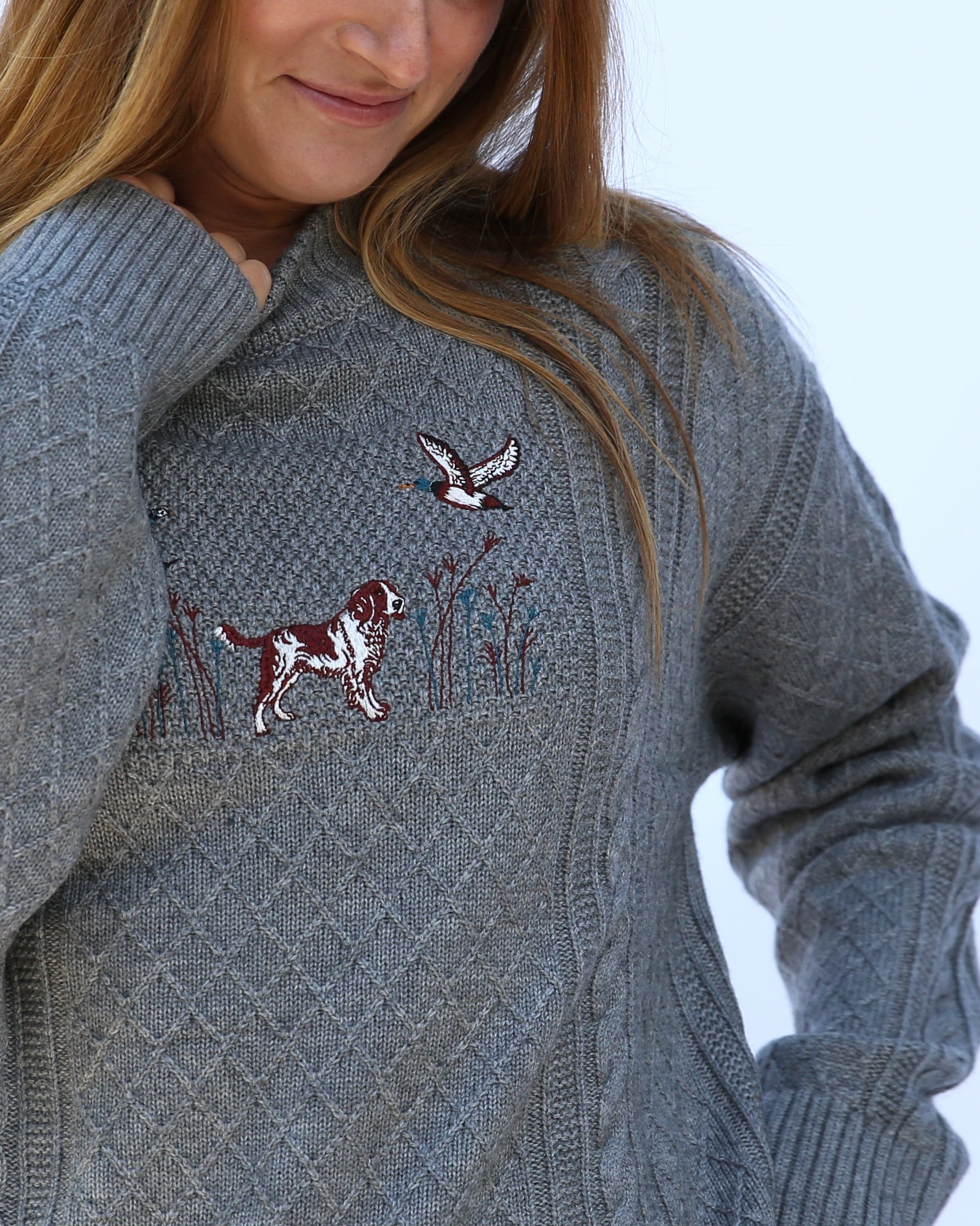 Wool blend cable knit Sweater featuring an embroidered English Springer Spaniel hunting field scene.