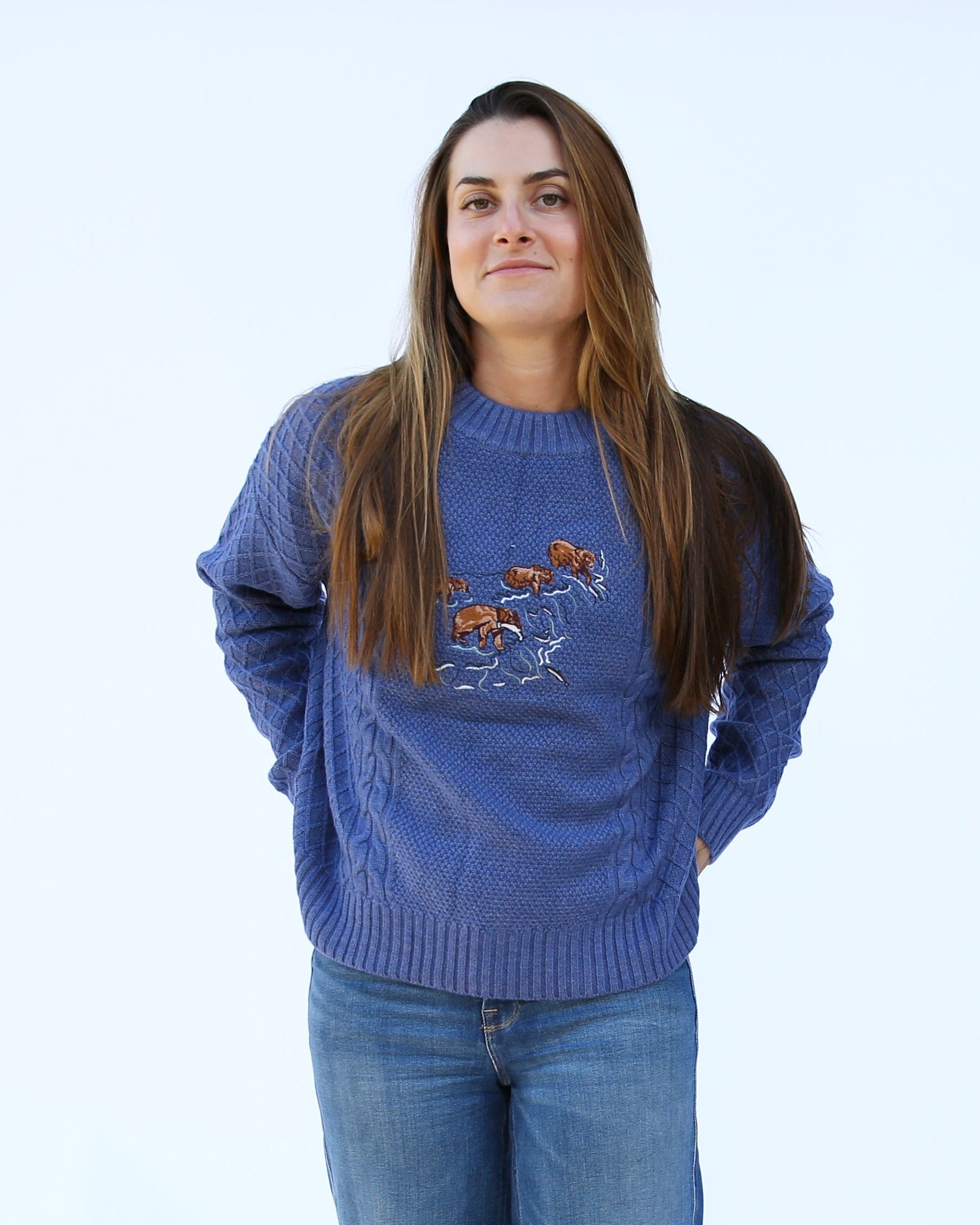 Wool blend cable knit Sweater featuring an embroidered scene of Alaskan Bears fishing for Salmon in Katmai National Park.